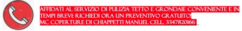 - Con circa 10 anni di esperienza alle spalle la ditta MC COPERTURE DI CHIAPPETTI MANUEL con sede a Senigallia (AN) e Montecchio (PU) cell. 3347820166 è diventata un punto di riferimento nel settore delle coperture edili, delle lattonerie e delle impermeabilizzazioni, offrendo servizi per ogni esigenza, tra cui la pulizia di tetti e grondaie. Non pulire le coperture edili e la lattoneria da solo.